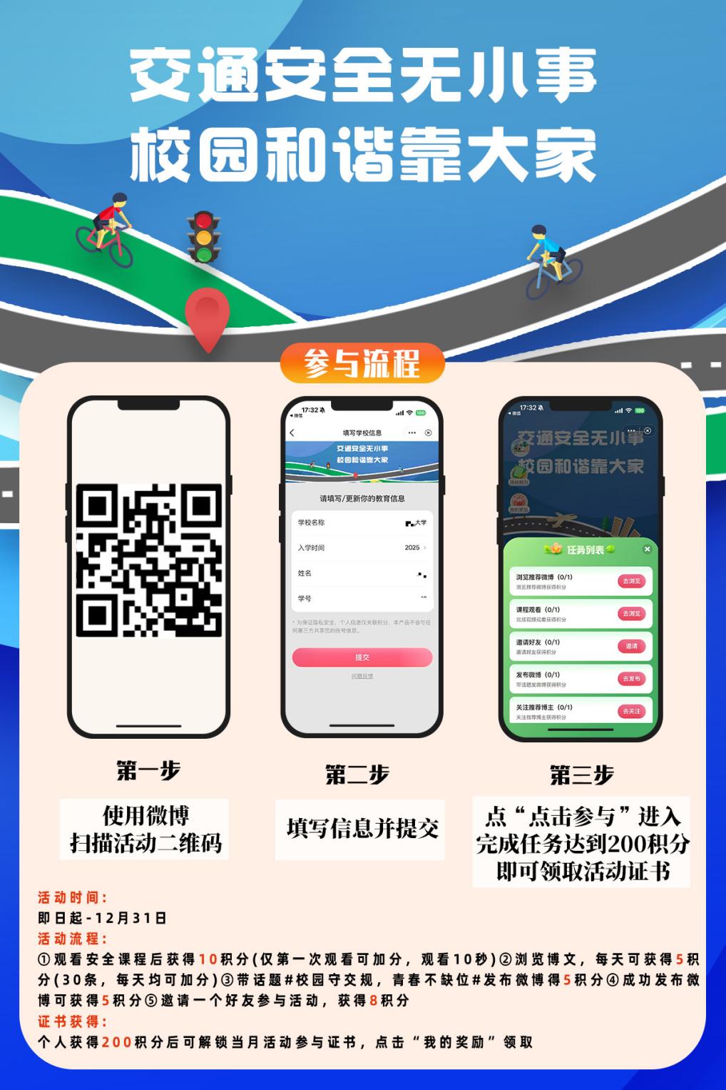通过微博平台开展线上交通安全教育专题课程,各学院积极组织并通知学生及老师进行课程观看学习。(具体观看路径见附件1)